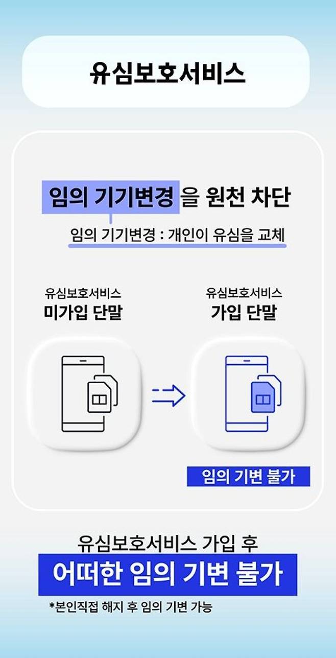 또한, 지난 22일부터 시행 중인 유심보호서비스는 유심과 단말기를 묶어 유심을 복제해 다른 단말로 기기를 변경하는 시도를 차단하며, 유심을 복제하더라도 다른 기기에서 사용할 수 없도록 한다. SKT에 따르면, 유심보호서비스만으로 유심 교체와 동일한 효과를 낼 수 있다.
