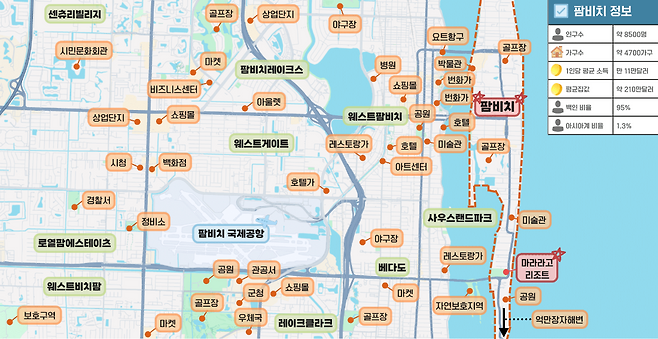 플로리다 현지 부동산 관계자는 “팜비치는 전형적인 백인들의 휴양 도시로 골프장, 시가클럽, 리조트, 마사지샵 등 중년 백인들을 위한 시설들이 즐비하다”며 “트럼프 대통령 등장 이전까진 평범한 부촌 휴양지였는데 최근 트럼프 대통령이 참모들과 ‘말라라고 리조트’에서 전 세계에 영향을 미칠 만한 굵직한 결정들을 내린 사실이 알려지면서 전 세계의 부자들이 팜비치로 유입되는 추세다”고 설명했다.