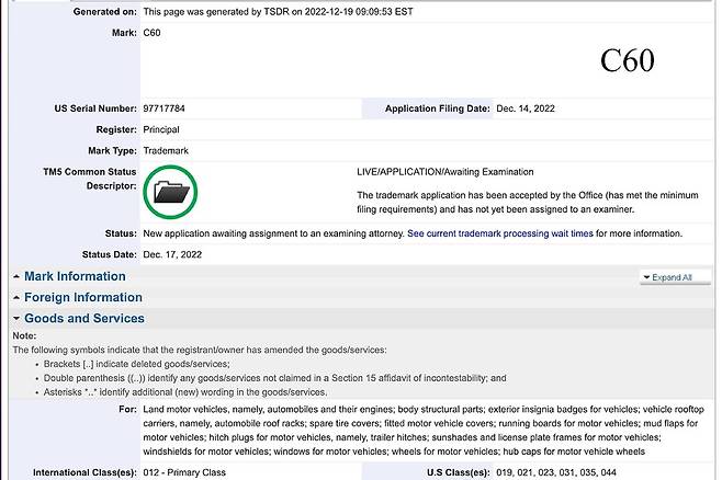 미국 외신에 따르면 볼보는 최근 미국 특허청에 'C60'이라는 이름의 상표를 출원했다.