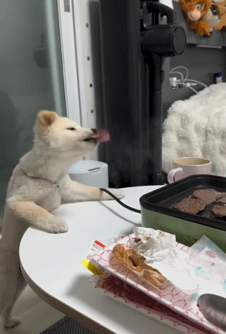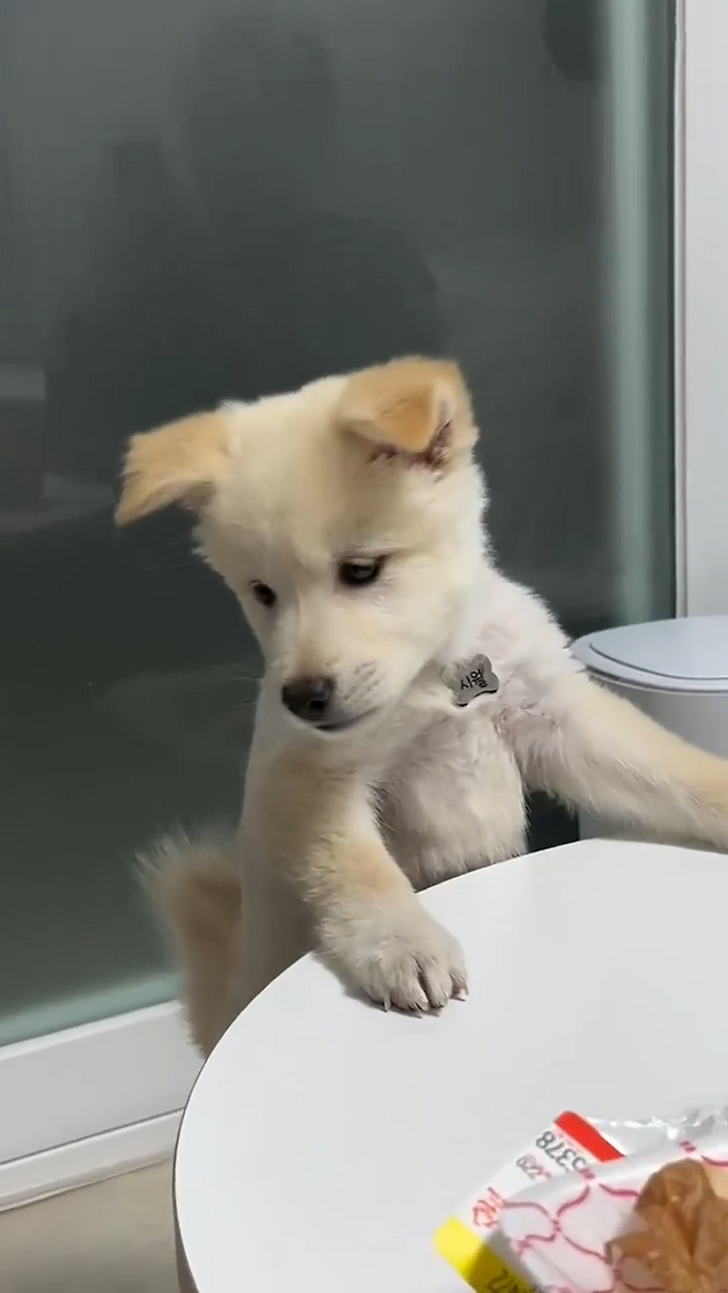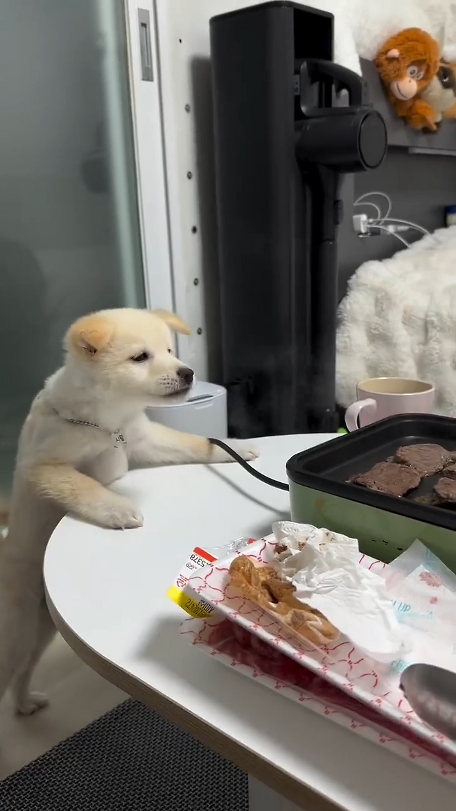 영상 속에는 하얀 털이 보송보송한 아기 강아지가 식탁 의자에 두 발을 올리고 서 있습니다. 녀석의 시선이 고정된 곳은 다름 아닌 노릇노릇하게 익어가는 소고기 불판인데요.