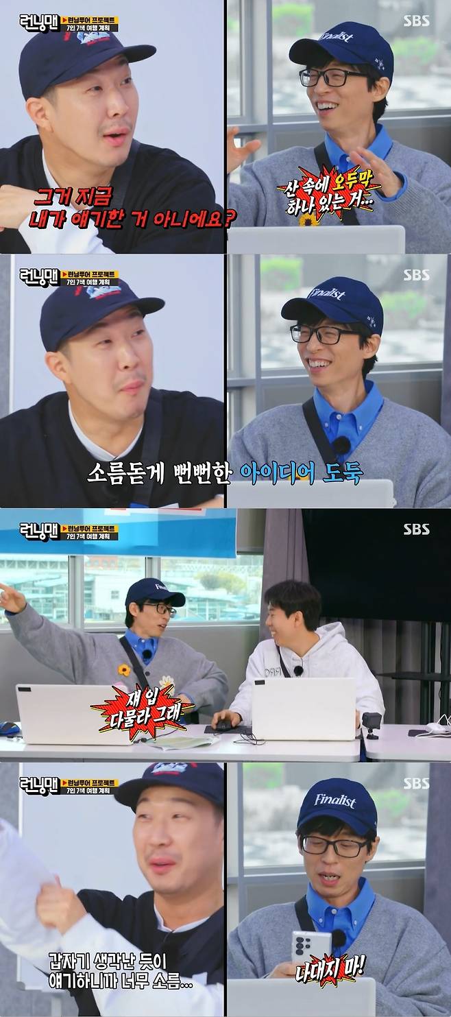 이에 유재석은 "나 생각났다. 어디인지는 모르겠지만 어디 큰 오두막 같은 곳 하나 빌려서"라며 하하의 의견을 그대로 뺏어 자신의 아이디어인 양 발표했다.