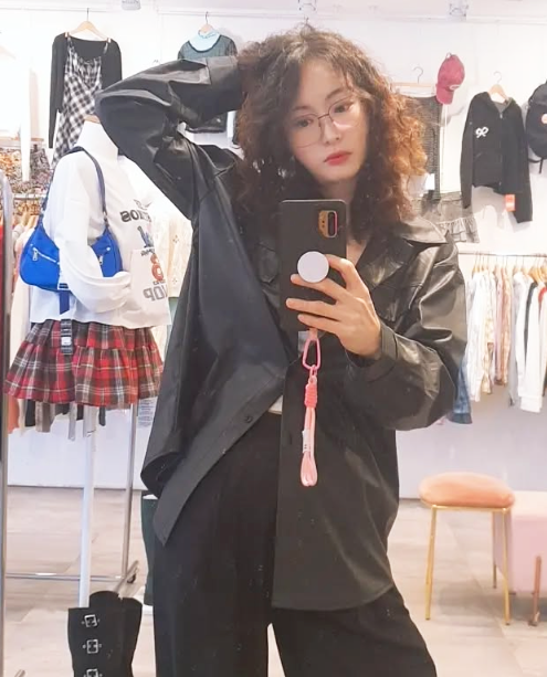 가죽 느낌의 셔츠 소재와 여유로운 실루엣이 트렌디함을 더하며, 자연스러운 곱슬 헤어와 안경 스타일링이 독특한 개성을 드러낸다.