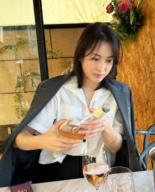 잔잔한 화장과 자연스러운 헤어스타일, 와인과 함께한 테이블 연출이 어우러져 도시적인 세련미가 느껴진다.