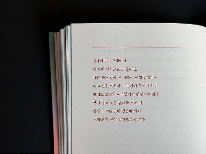 빌헬름 슈미트는 『삶으로 다시 날아오르기』에서 이렇게 말한다. “인생이라는 그네에서 더 높이 날아오르고 싶다면, 지금 하는 것에 온 마음을 다해 몰입하여 나 자신을 오롯이 그 순간에 두어야 한다.” 결국 삶을 살게 하는 힘은 지금 이 순간에 있다.