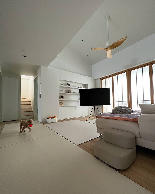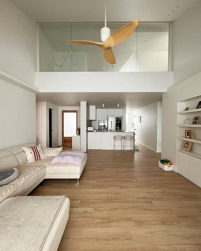 저희 집은 복층집이라 거실 층고가 거의 4m로 매우 높아요. 높은 천고의 장점을 살려 실링팬을 달았는데 이국적이면서도 너무 시원하고 좋아요.