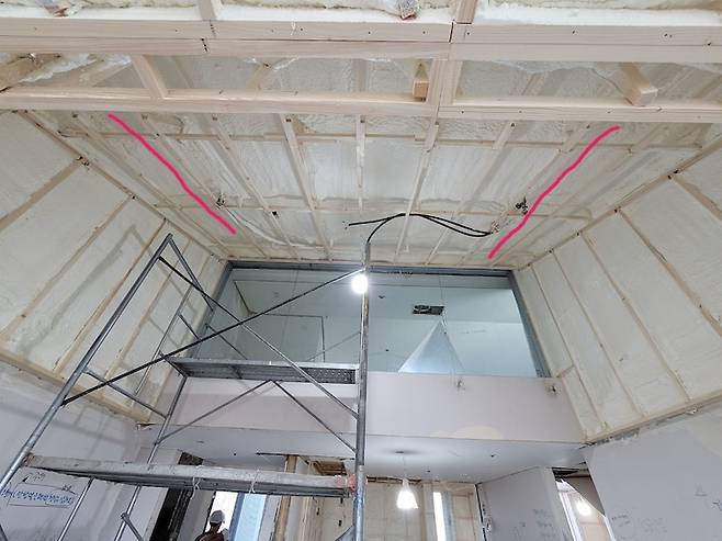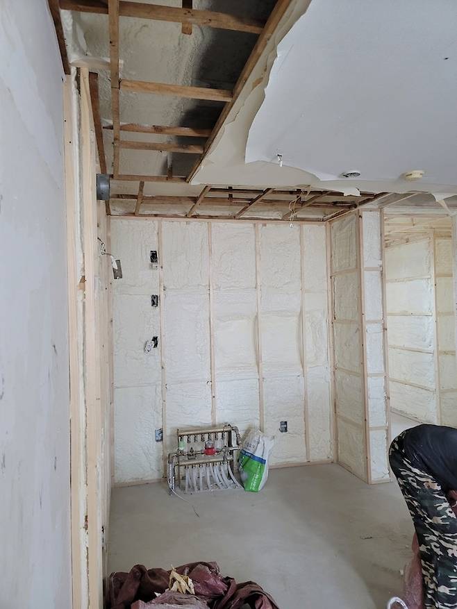 매도자분께서 집이 너무 추웠다고 하셨고 또 남편도 어릴적 탑층 살았을 때 추웠던 기억밖에 없다고 해서 단열에도 힘을 줬습니다. 보통 단열한다고 하면 아이소 핑크를 붙이는 경우가 많은데 저희 집은 층고도 높고 해서 경질폼 단열로 진행했어요. 경질폼 단열은 각재로 폼을 쏠 공간들을 만들어준 다음 엄청 큰 기계로 폼을 쏴줍니다.