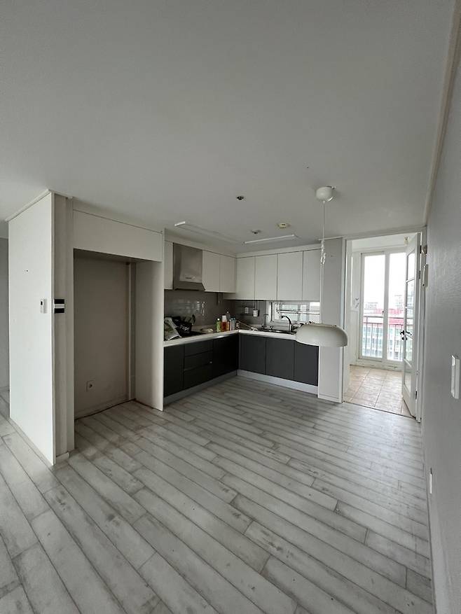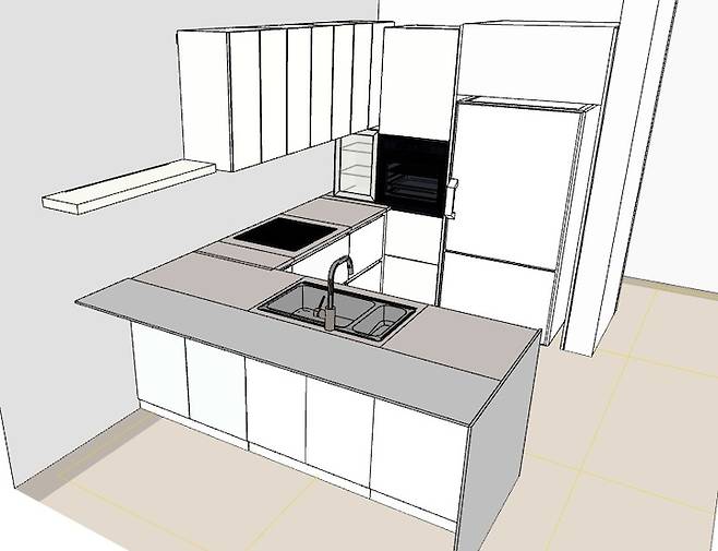 주방입니다. 저는 딱히 대면형 주방에 대한 로망은 없었지만 아무리 머리를 짜내도 이렇게 밖에 구조가 안 나오더라구요. 냉장고를 놓기 위해 세탁실로 나있던 쪽창을 막았습니다.