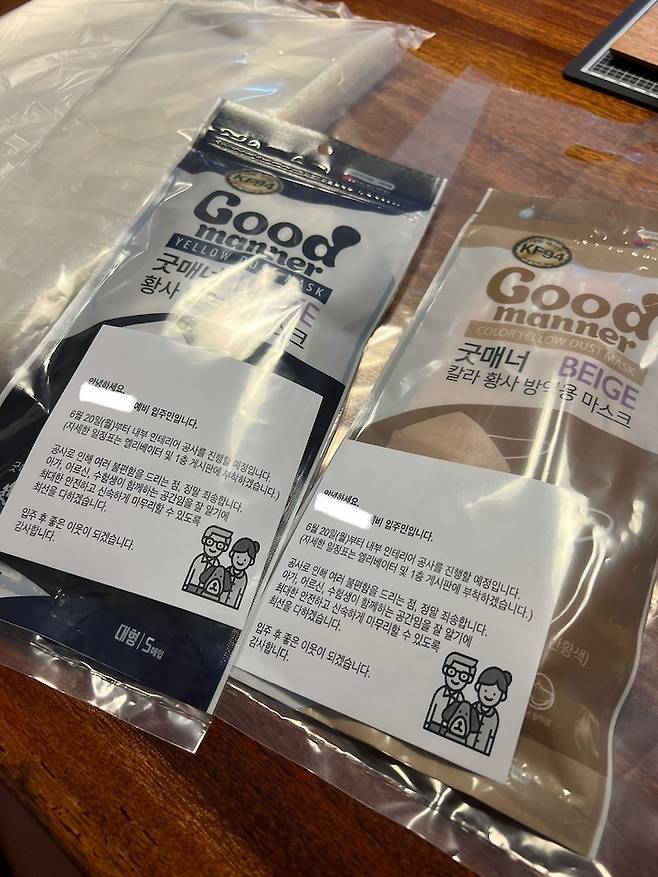 인테리어 전, 저희 동 전체에 안내문과 함께 마스크를 돌렸어요. 이런 선물들은 내 마음이 편하고자 하는 것이니 안하셔도 무방합니다. 문구는 오늘의집에서 제공하는 템플릿을 활용했고 일러스트는 저희 가족 구성과 맞는 걸 찾아 바꿨고 또 인접세대 5집은 휴지와 함께 직접 인사드렸어요. 저희 아파트 분들은 진짜 너무 좋으셔서 두 달 동안 민원 한 번 없으셨어요.