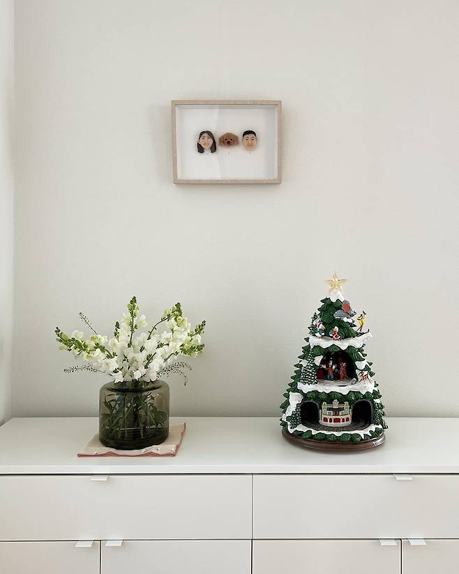 중문을 열고 들어가면 바로 보이는 거실 벽에 매립선반을 짰는데 우리 세 식구는 이런 추억을 갖고 있어요- 를 제일 먼저 보여주고 싶어서 이렇게 디자인 해봤어요. 물론 이 벽에 월패드가 있었는데 그걸 멀리 옮기는 건 또 큰 일이라 겸사겸사 이렇게 배치했습니다.