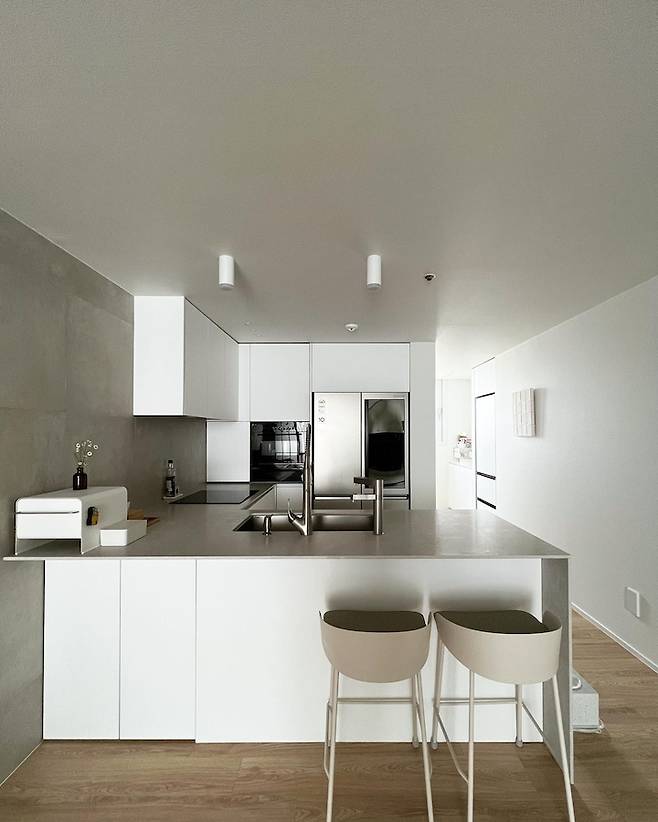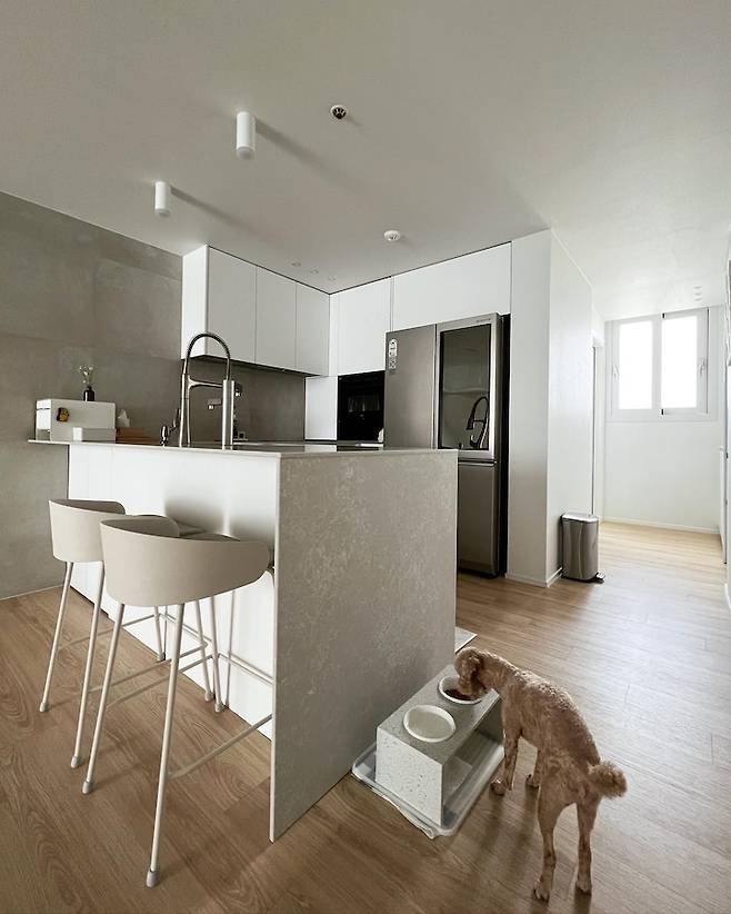 주방 상판은 칸스톤 루나화이트, 가구는 한솔 pet 퍼펙트 화이트입니다. 보통 아일랜드 옆판 마감은 가구 재질로 하는데 저는 여기에 강아지 식기를 둬서 오염될까봐 상판과 동일한 칸스톤으로 마감했어요.