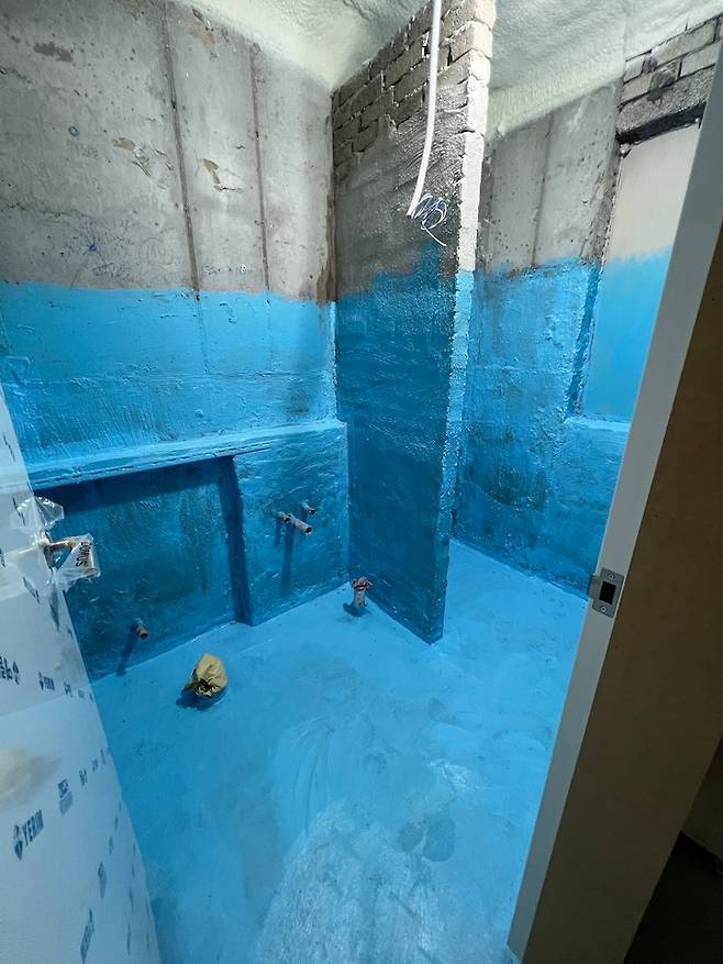 타일 붙이기 전, 아쿠아디펜스 제품 사용해 도막 방수도 셀프로 해줬습니다. 쓱쓱 바르기만 하면 되서 누구나 쉽게 하실 수 있을거에요.