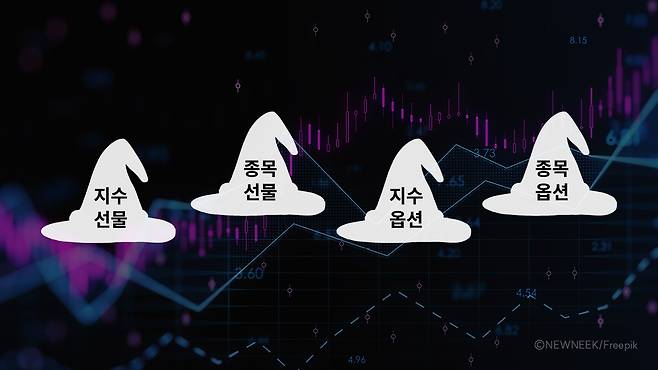 네 마녀는 주가지수 선물과 옵션, 개별주식(예: 삼성전자) 선물과 옵션 이렇게 4가지 파생상품*을 의미해요. 선물과 옵션은 주식과 달리 상품을 보유할 수 있는 최대 기간(=만기)이 정해져 있어요. 미래의 정해진 날짜에 거래하는 계약이기 때문. 이 4가지 상품의 만기일이 모두 겹치는 날을 ‘네 마녀의 날'이라 해요.