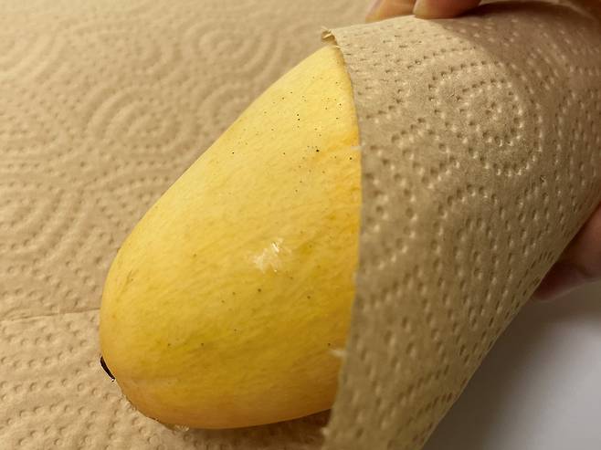 이 방법으로 망고를 1개씩 감싸서 2~3일 동안 실온에서 후숙 시켜 보세요. 껍질이 노랗고 눌렀을 때 말랑한 느낌이 들면 후숙이 충분히 된 것입니다.