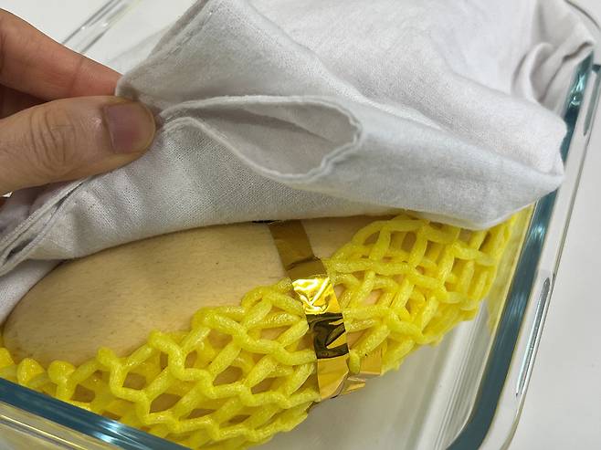 망고 위에 천으로 된 헝겊을 덮어 줍니다. 헝겊으로 덮으면 습기를 흡수하거나 조절하여 쉽게 물러지거나 곰팡이가 생기지 않습니다.
