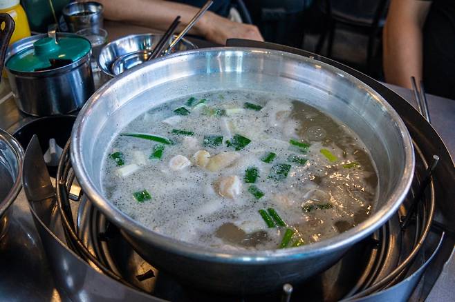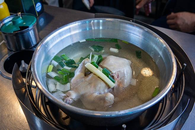 한여름에는 테이블 위에서 끓이는 닭 한 마리의 열기로 아무리 에어컨을 세게 틀어도 실내 온도가 떨어지질 않는다. 여름 보양식을 먹으러 간다면 마치 사우나에서 먹는 느낌은 각오를 하는 것이 좋다. 뭐 다른 메뉴가 있는 것도 아니다. 오로지 닭 한 마리. 느낌은 삼계탕의 친척쯤 되는데 약간 서민적인 삼계탕이라고 해도 될 듯하다. 그저 탕 안에 듬성듬성 자른 닭 한 마리가 조각으로 들어가 있고 감자와 채소를 넣어 끓여 먹는다. 고기가 익으면 먼저 고기를 먹고 남은 국물에 칼국수를 넣어 먹는다. 그렇게 고기와 칼국수를 모두 먹는 방식이다.