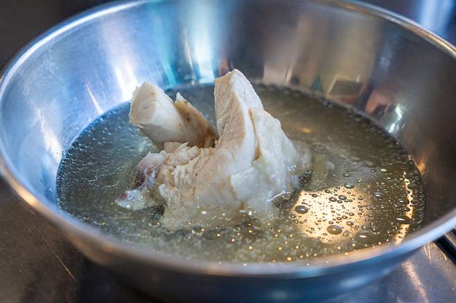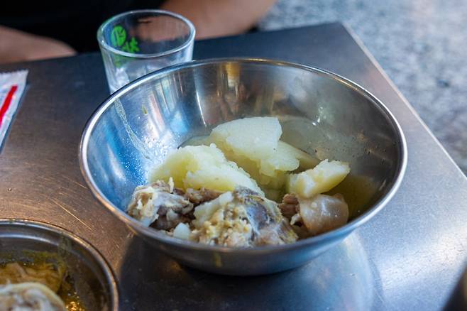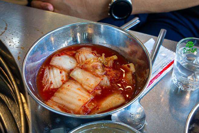 투박한 양푼은 마치 김치찌개가 나올 것 같지만 맑은 육수에 닭 한 마리가 들어있다. 의외로 깔끔한 맛이다. 삼계탕처럼 진한 맛은 아니지만, 맑고 깨끗한 맛이다. 일단 조금 익으면 부지런히 닭을 먹기 좋게 자른다. 원래 나오는 닭이 그리 크지 않아 2인 1마리도 조금 부족할 수는 있을 듯. 외국인의 시선에는 이렇게 닭이 한 마리 덜렁 나오는 게 조금 신기할 수도 있겠다는 생각이 든다. 너무 사람이 많으므로 서비스를 기대할 수는 없다. 김치도 물도 모두 셀프서비스이다.