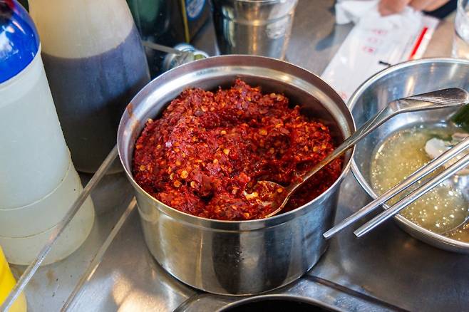 같이 먹으면 좋은 양념장도 직접 만든다. 매콤한 기본 소스 양념장에 입 맛에 따라 겨자와 식초, 다진 마늘, 간장 등을 더 넣고 조합하면 자신만의 멋진 양념장이 된다. 담백한 맛을 좋아한다면 아무것도 넣지 않고 그냥 맑은 탕으로 먹는 게 좋고, 얼큰한 것이 좋다면 양념장과 김치를 넣어 먹는 것을 추천한다. 매콤한 국물 맛이 일품이다. 칼국수 사리를 주문할 때는 주의할 것이 테이블마다 추가 주문이 되지 않기 때문에 처음에 먹을 만큼의 양을 주문해야 한다. 칼국수와 김치 그리고 얼큰한 육수를 같이 먹다가 소주 한잔하면 바로 여름이 물러가는 느낌이다.