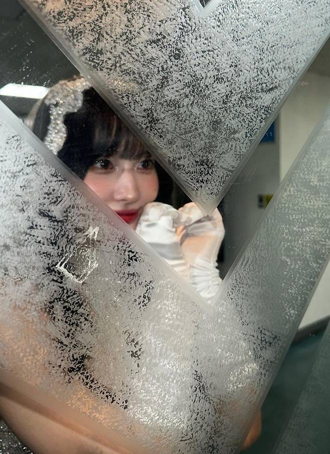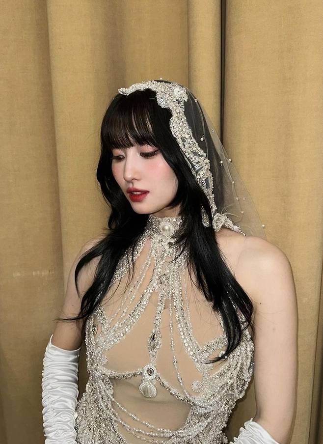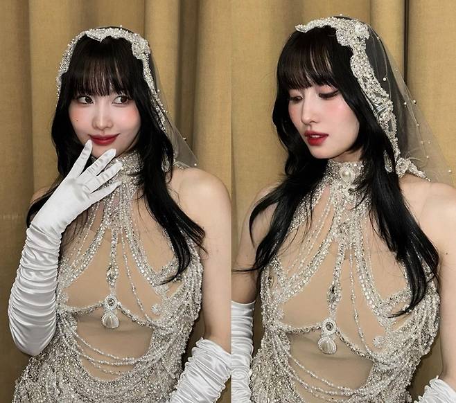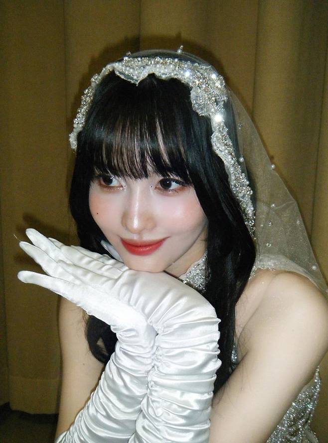 공개한 사진에서 모모는 헤어밴드 베일에 치명적인 누드 톤의 시스루 스팽글 드레스룩으로 청순하면서도 섹시한 스타일을 완성했다.