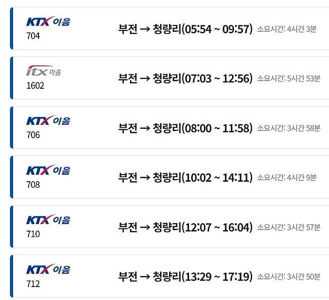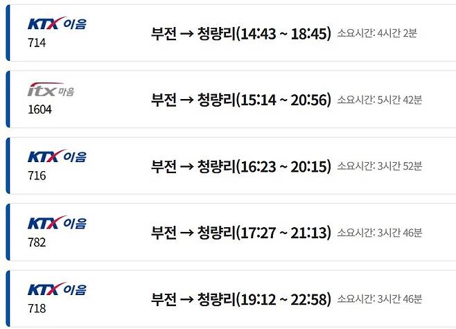 μ¨λΌμΈ μλ§€: κ°μ₯ μΌλ°μ μ΄κ³ νΈλ¦¬ν λ°©λ²μ μ½λ μΌ κ³΅μ ννμ΄μ§(letskorail.com) λλ λͺ¨λ°μΌ μ± **'μ½λ μΌν‘'**μ μ΄μ©νλ κ²μ λλ€. μΆλ°μμ 'λΆμ 'μΌλ‘, λμ°©μμ 'μ²λ리'λ‘ μ€μ νκ±°λ κ·Έ λ°λλ‘ μ€μ νμ¬ μνλ λ μ§μ μκ°μ μ‘°νν ν, μ’μμ μ ννκ³ κ²°μ νλ©΄ λ©λλ€.