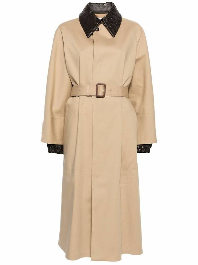 베이지 컬러의 긴 실루엣 위에 보테가 특유의 위빙 디테일이 들어간 블랙 카라가 포인트다.