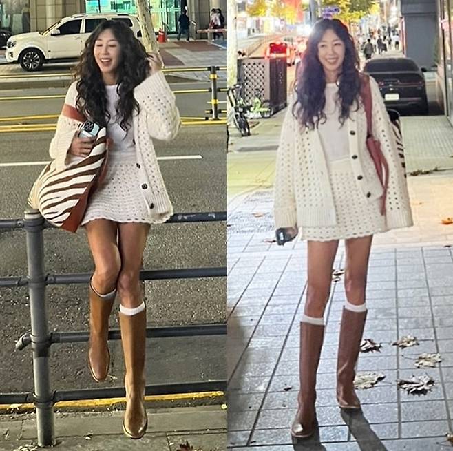 공개한 사진에서 전미라는 늘씬한 각선미가 돋보이는 니트 미니 스커트에 롱 부츠를 신고, 니트 카디건을 착용한 니트 셋업 슈트룩으로 20대 같은 감각적이면서도 영한 스타일로 눈길을 사로잡았다.