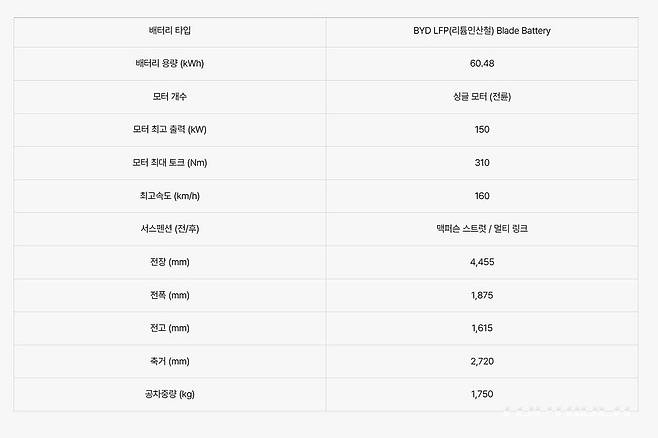 아토3는 BYD 전기차 전용 플랫폼 E-플랫폼 3.0을 기반으로 한다. 60kWh 리튬인산철(LFP) 배터리를 탑재해 1회 완충시 국내 기준 상온 복합 321km, 저온 복합 309km를 주행할 수 있다. 가격 대비 제원상 주행거리는 무난한데, 외부 온도 영향을 많이 받는 것으로 나타났다.