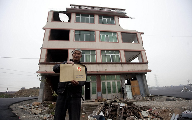 이런 ‘네일하우스(딩쯔후, 못집)’ 현상은 단지 예씨의 사연만이 아니다. 강력한 개발 압력과 보상 현실에 불만을 품은 지방 도시 주민 사이에서 비슷한 사례가 속출한다. 네일하우스는 쉽게 뽑히지 않는 못과 같아 강제 개발에 반발하는 시민 저항의 상징이 됐다.