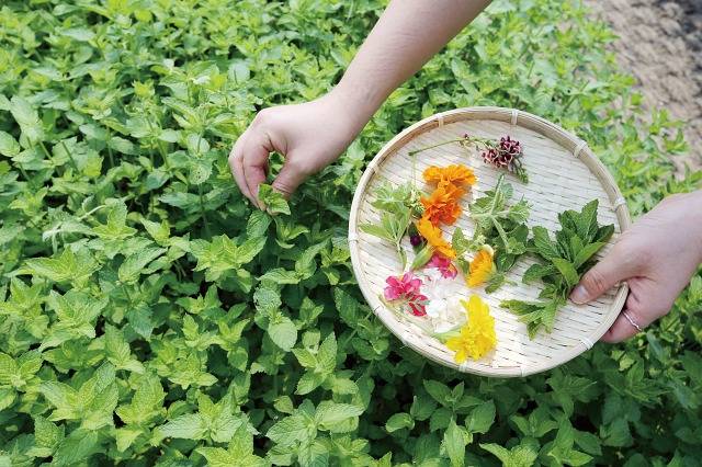 호기심에 가득 찬 참가자들이 소쿠리를 들고 돌아다니며 꽃을 따기 시작했습니다. 마리골드, 팬지, 베고니아, 스테비아 등 10여 종의 꽃과 더불어 라벤더와 로즈마리 등 허브까지 식용작물로 소쿠리가 금방 한가득 채워졌습니다. 한여름 불볕더위에 등줄기로 주르륵 땀이 흘렀지만 농장에 모인 참가자들은 식물을 직접 따서 맛보고 향을 맡으면서 프로그램 진행 내내 함박웃음을 지었습니다.