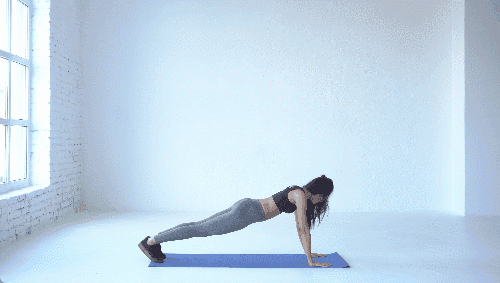 플랭크 기본자세로 엎드린 후, 오른쪽 팔꿈치를 먼저 구부려 바닥에 대고 이어서 왼쪽 팔꿈치도 구부려 팔꿈치 플랭크 자세를 만듭니다. 다시 오른팔, 왼팔 순서로 펴서 원래 플랭크 자세로 돌아옵니다.