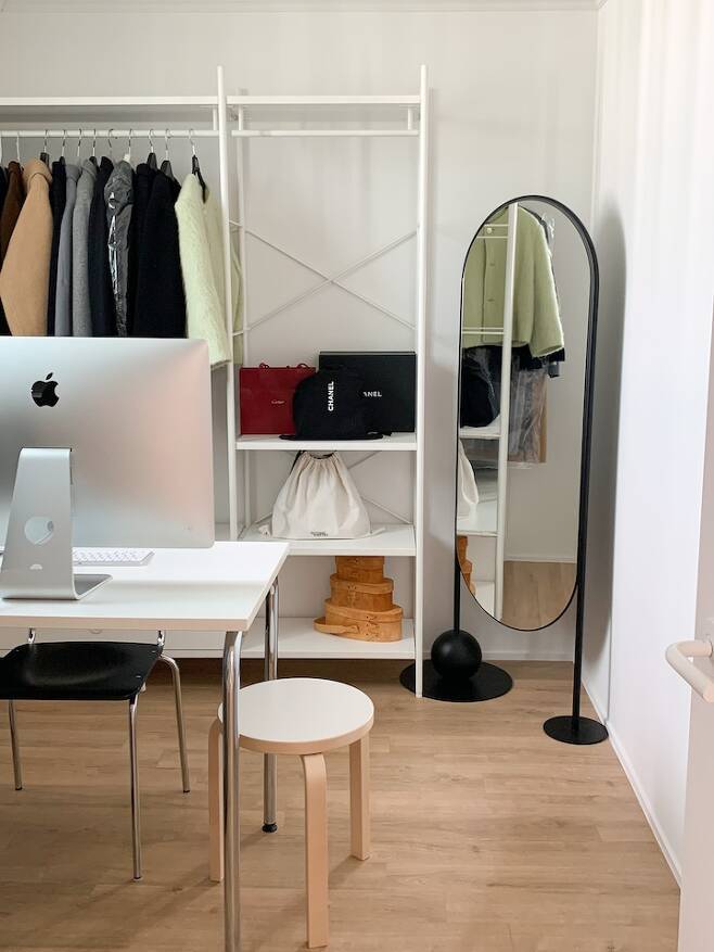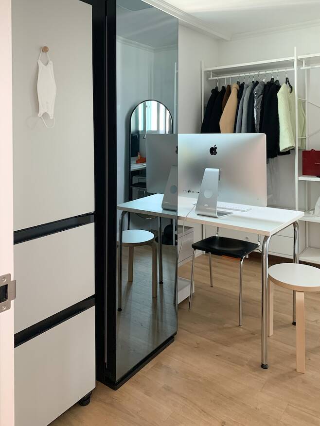 그 안쪽으로는 데스크톱과 책상을 두었고, 가장 안쪽 벽에는 행거와 수납장을 설치했어요.