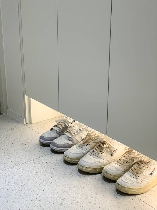 현관이 많이 비좁았기 때문에 현관문 필름이나 타일, 신발장 등을 화이트나 밝은 아이보리 계열로 통일감을 주고, 자칫 밋밋해 보일 수 있는 밝은 톤의 현관에 테라조 타일로 살짝 포인트를 주었어요. 너무나 만족스러운 지금의 현관이지만, 밝은 컬러인 데다가 외부와의 접촉이 가장 많은 공간이라 아무래도 오염에 취약할 수밖에 없더라고요.
