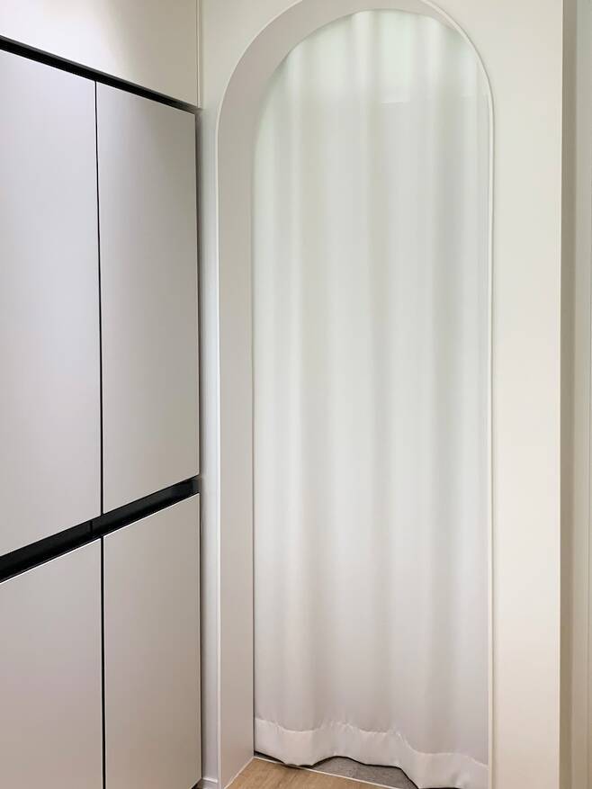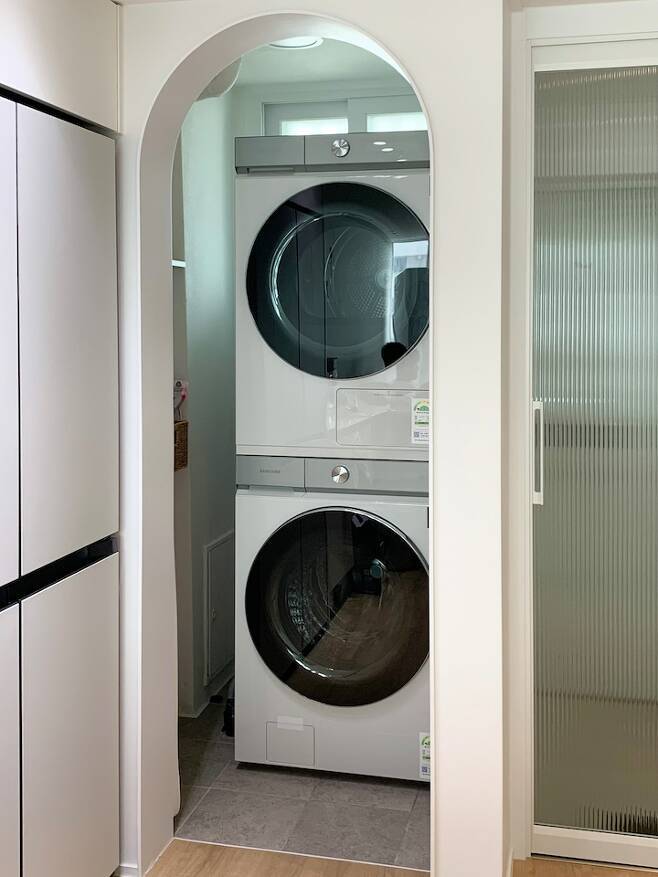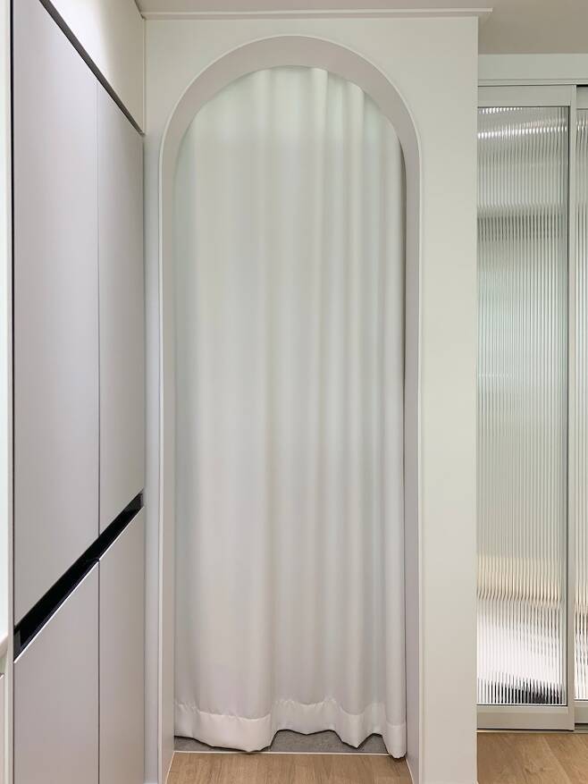 또, 문을 포기하는 대신 세탁실 입구를 아치형으로 제작하면 포인트가 될 것 같아 아치형 가벽을 요청했어요.