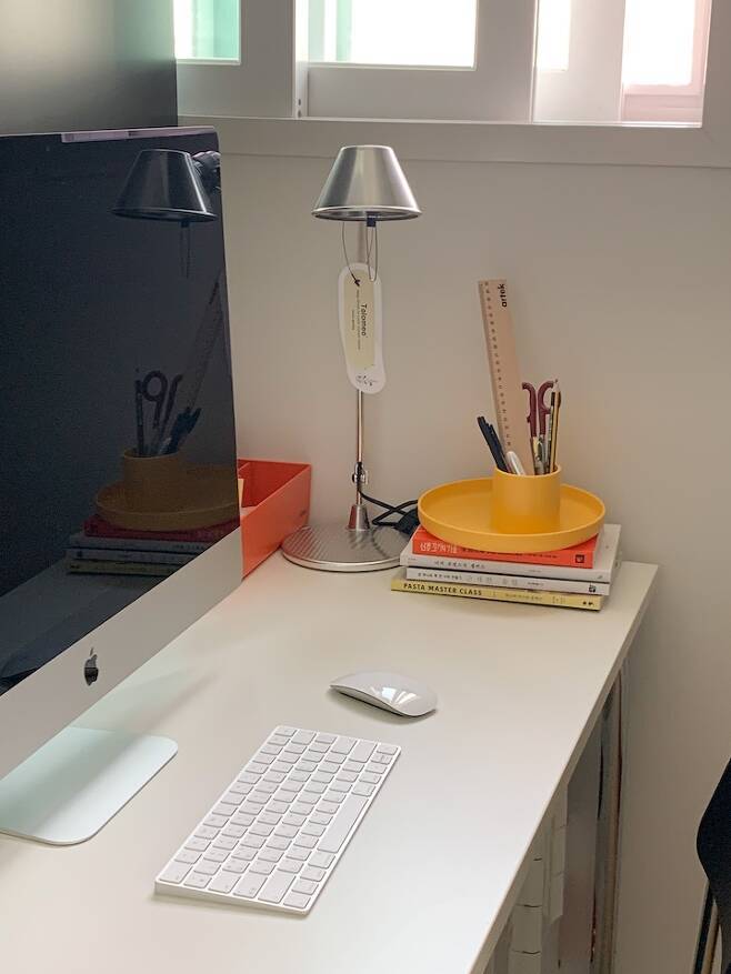 작은방에 책상이 설치되기 이전에는 데스크톱을 아일랜드 식탁에 놓고 업무를 보기도 했어요. 넓은 아일랜드 식탁의 장점이 식탁, 조리공간뿐만 아니라 이렇게 책상의 역할도 가능하다는 점 같아요.