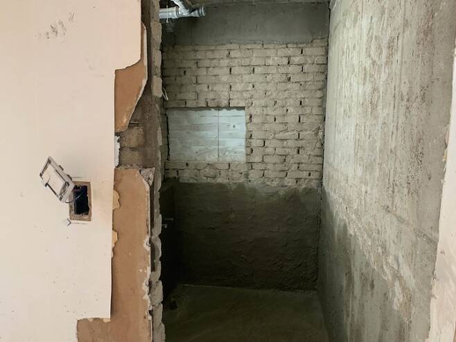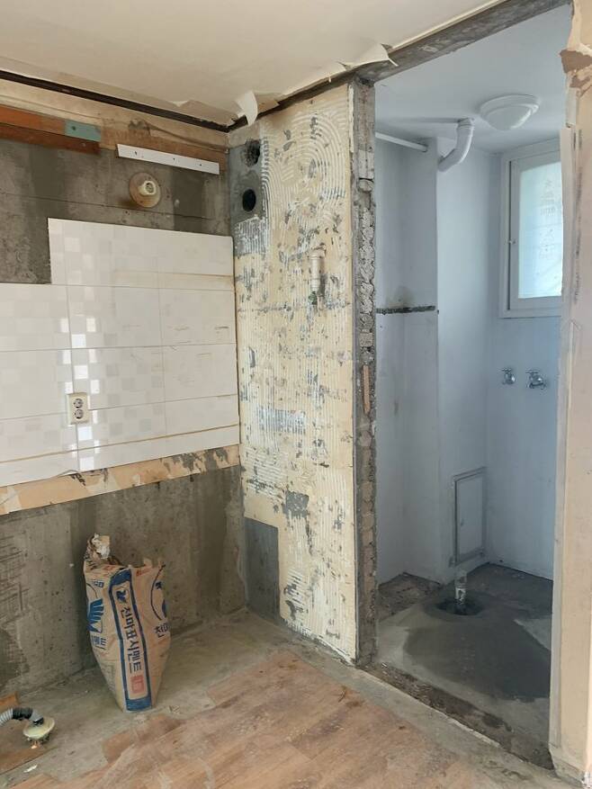 준공 이후 타일 덧방이 되어 있던 기존 욕실의 모습과 철거 이후 시멘트 작업이 진행된 욕실의 사진입니다.