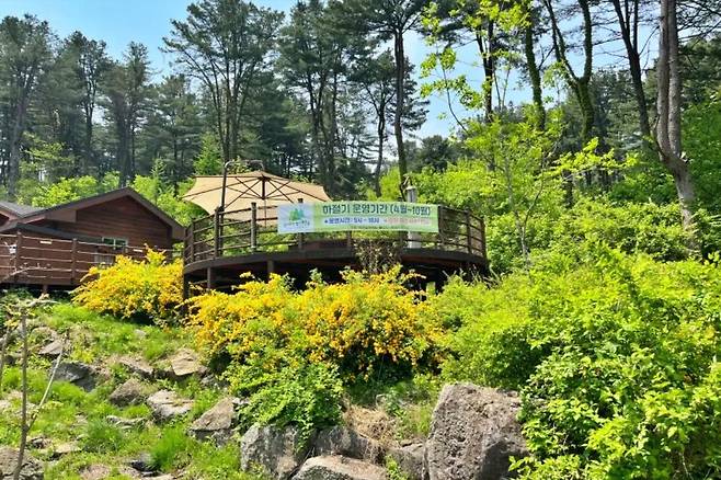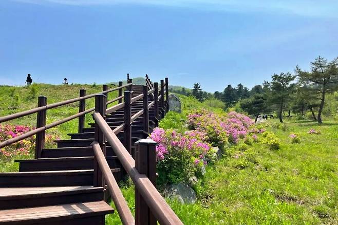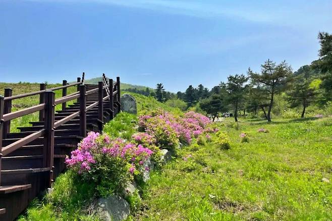 정상에 도착하면 ‘사방댐’이 등장한다. 산불 진화용 헬기 취수원으로도 사용되는 인공호수지만, 침엽수와 철쭉이 어우러진 풍경 덕분에 그림 같은 풍경을 자랑한다. 수면에 반사되는 나무 그림자와 푸른 하늘이 어우러져 잠시 머무르고 싶은 감성을 자극한다.