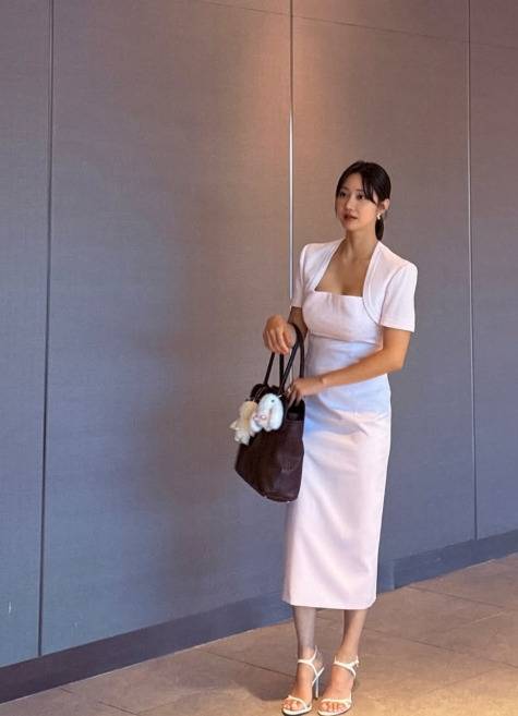라이트 핑크톤의 스퀘어넥 원피스를 선택했는데요. 어깨선이 살아있는 미니 볼레로 디테일이 드레시한 느낌을 더하며, 허리라인은 정교하게 들어가 있어 몸매의 실루엣이 자연스럽게 드러났습니다.