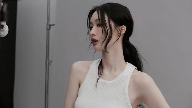 두 번째 컷에서는 슬리브리스 니트 톱 하나만으로 군더더기 없이 깔끔한 미니멀룩을 연출했으며, 블랙 헤어를 하나로 묶어 시원하고 세련된 느낌을 강조했다.