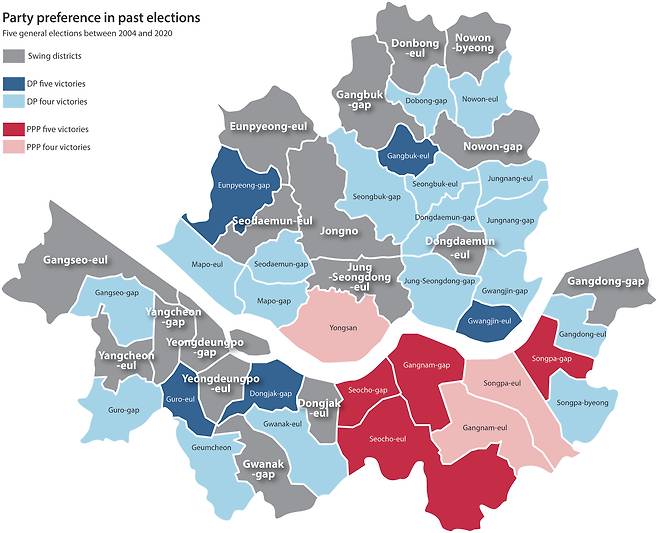 Some 30 of Seoul's 49 constituencies have voted for the same party in at least four of the past five elections.