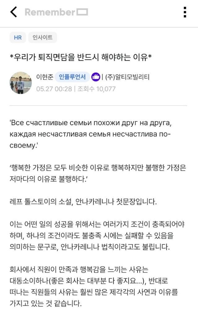 이직이 활발해질수록 회사는 인재 확보에 어려움을 겪고 있습니다. 과거에는 좋은 인재를 영업하는 데만 신경 썼다면, 현재는 이와 동시에 회사의 핵심 인재 유출을 막아야 하기 때문이죠. 이직 러시를 막으려면 어떻게 해야할까요? 직장인들의 소통 공간 리멤버 커뮤니티에선 퇴사자들과의 면담이 중요하다는 이야기가 나왔습니다. 어차피 나가겠다는 사람의 이야기가 왜 중요하다는 건지 이현준 님의 글을 재구성해 소개합니다.