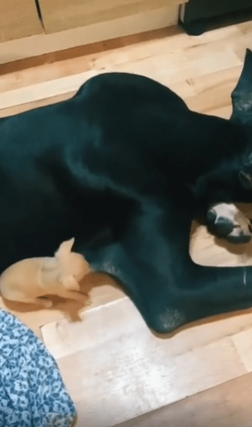 넓은 실내 바닥 위, 한 마리의 검은 대형견이 조용히 앉아 있습니다. 그 크기와 풍채만으로도 위압감이 느껴질 법한 존재 앞에, 믿기지 않을 정도로 작은 새끼 강아지가 한 마리 서 있죠. 몸무게는 비교도 안 될 만큼 가볍고, 다리 길이도 털의 부피보다 짧아 보일 정도. 하지만 마음만큼은 절대 작지 않습니다.