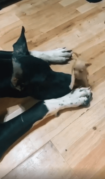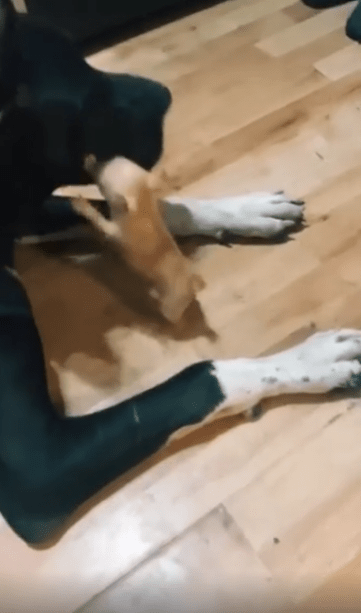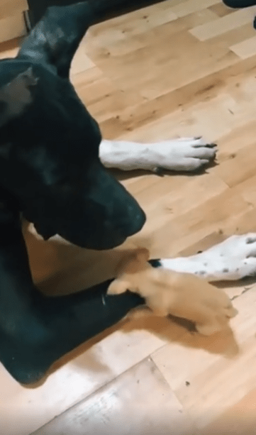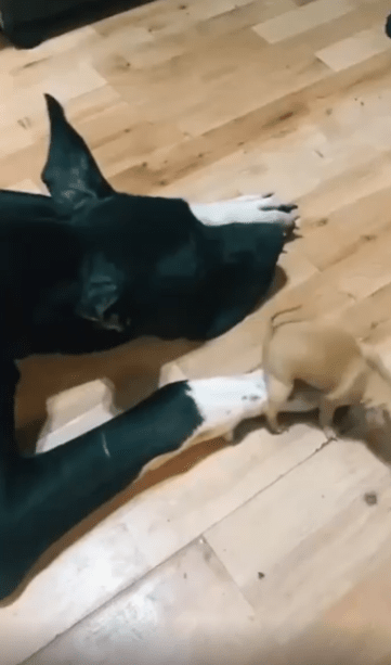 그러나 이 작은 강아지에겐 자신이 작다는 인식은 없어 보입니다. 오히려 대형견의 크기에도 전혀 위축되지 않은 채, 장난감처럼 느껴졌을지도 모르는 존재를 향해 전력으로 돌진하는 당당함이 인상적입니다.