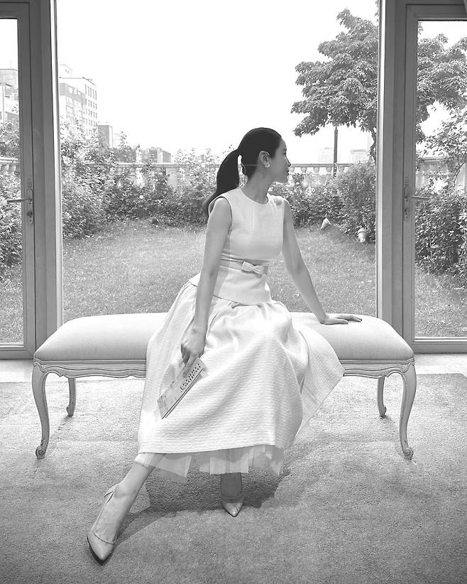 다른 컷에서는 A라인 실루엣의 아이보리 드레스를 매치했는데, 이태란 특유의 절제된 분위기와 맞물리며 우아한 무게감을 형성했어요.