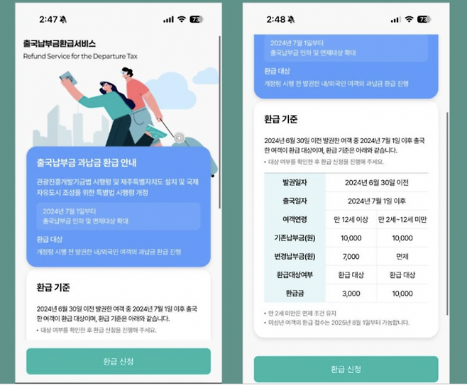 2024년 7월 1일부로 ‘출국납부금(일명 출국세)’ 제도가 개편되면서, 특정 조건을 만족한 해외여행객이라면 과납한 금액을 돌려받을 수 있게 됐습니다. 이전에 항공권을 구매했지만 7월 이후 출국한 분이라면, 환급 대상에 해당하는지 꼭 확인해보시길 바랍니다. 특히 가족여행 등으로 어린이와 함께 출국한 경우라면, 환급 금액이 생각보다 클 수 있습니다.