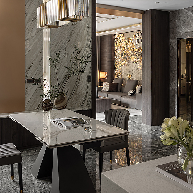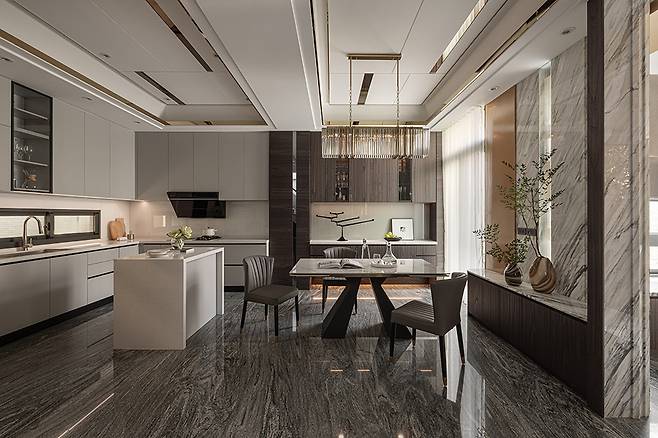ㄷ자 모양의 아치형 문을 지나면 개방형 다이닝룸과 주방이 하나로 연결된 공간이 나타난다. 대리석과 티타늄 장식, 크리스털 샹들리에가 어우러져 고급 레스토랑 같은 분위기를 만들어낸다. 중앙에는 석영석 상판의 아일랜드를 두어 요리 도구와 그릇들을 수납할 수 있게 했다.