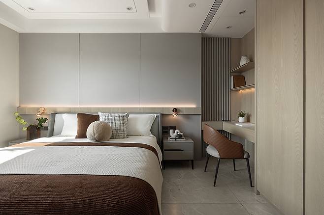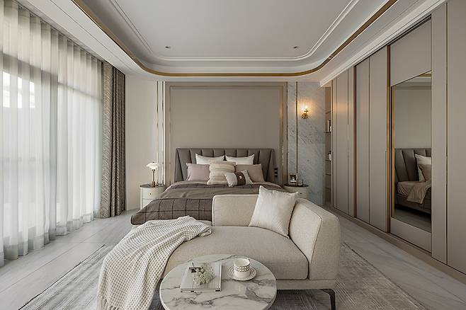 2층 주침실은 부드러운 밀크티 색상을 기본으로 하고, 티타늄 장식으로 둥근 몰딩 천장을 꾸며 부드러운 느낌을 강조했다. 침대 헤드보드는 대형 타일로 포인트를 주어 소재의 대비미를 살렸다.