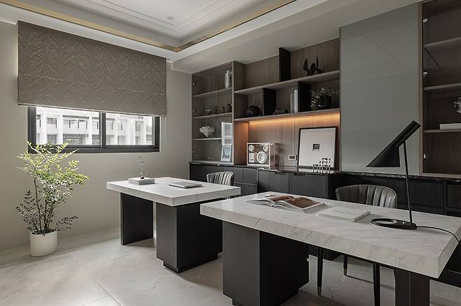 두꺼운 대리석 상판과 검은 철제 다리로 만든 맞춤 책상은 중요한 지위를 상징하는 듯한 당당함을 보여준다. 금고도 필요한 위치에 설치해서 실용성을 더했다.