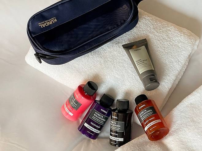피부 보습과 진정에 도움을 주는 '쿤달 허니 앤 마카다미아 퓨어 바디워시(100ml)와 바디로션(100ml)', 펄라이트 10,000ppm이 함유되어 묵은 각질까지 케어 가능한 '쿤달 울트라 마이크로 휩 펄라이트 클렌징폼(50ml)' 등의 어메니티로 구성됐다.