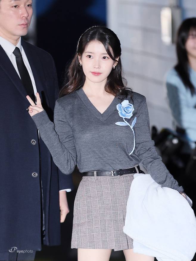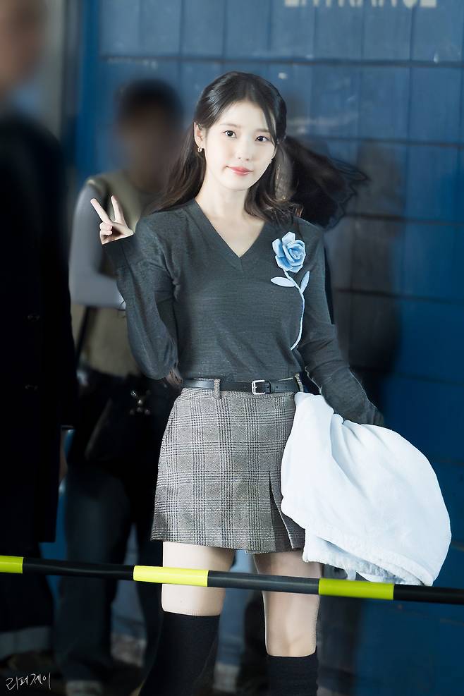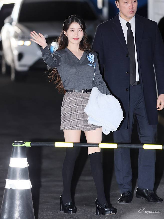 아이유는 체크 미니스커트에