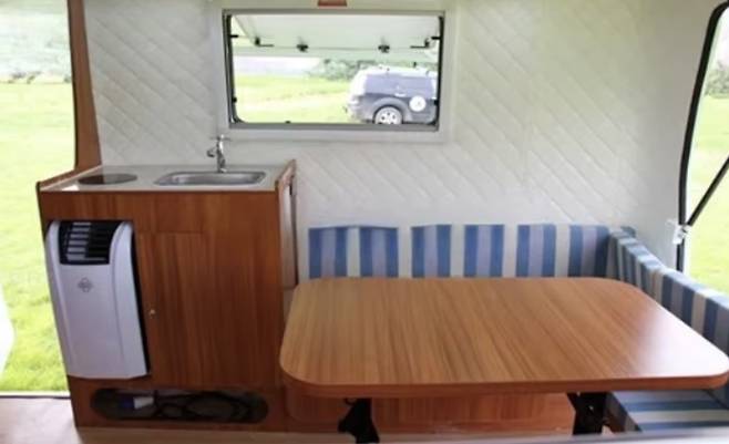 내부는 최대 5명이 잘 수 있도록 설계됐다. 후면에는 벤치형 좌석을 배치해 소파처럼 사용할 수 있으며, 침대로 변환하면 3명이 취침할 수 있다. 전면에는 2층 침대가 마련돼 있어 추가로 2명이 잘 수 있다.