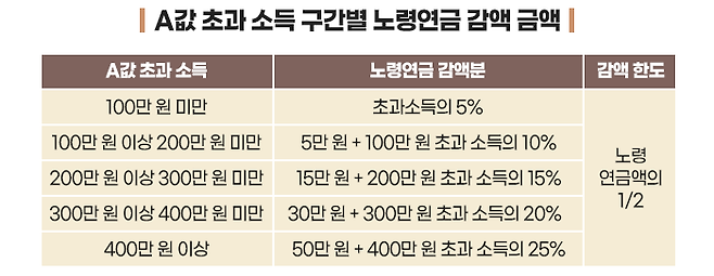 이렇게 해서 최대 본인 노령연금 수령액의 절반까지 감액될 수 있습니다.